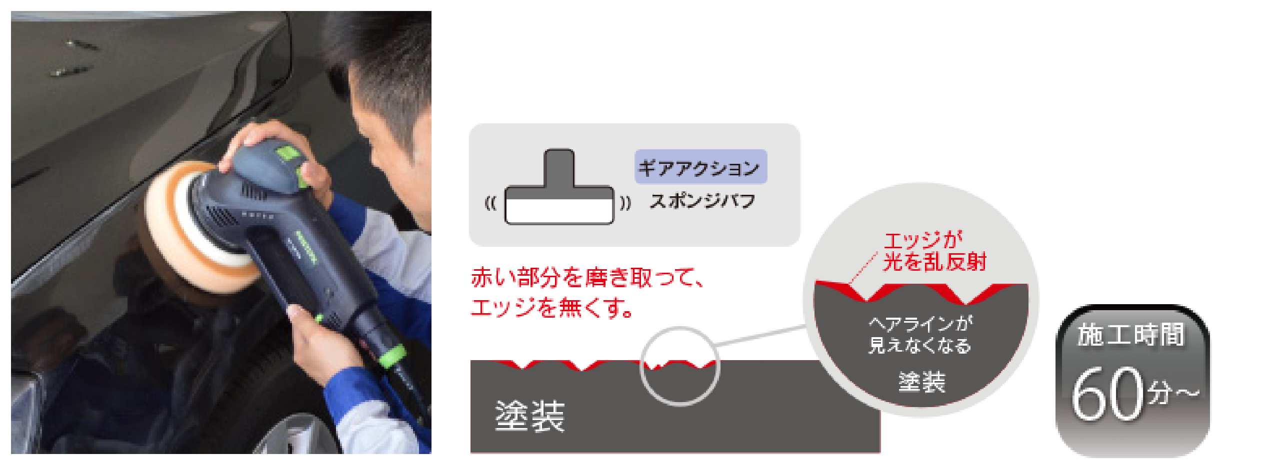 キズのエッジ部分だけを磨き取る研磨。塗装本来の輝きを取り戻します。